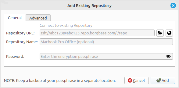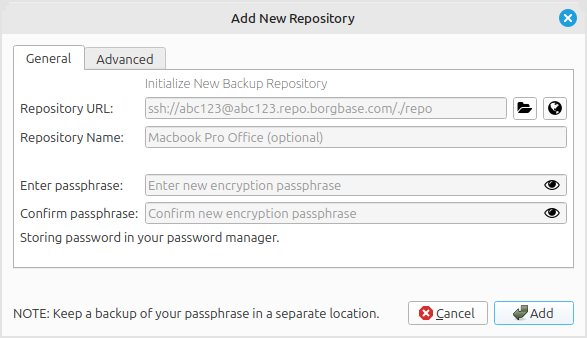 icon to select the directory where you would like your new Borg repository to be initialized. Enter in your chosen passphrase for the repository. Make sure and store your passphrase somewhere safe! When you are sure all of the information you have entered in is correct, hit Add.