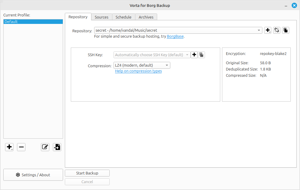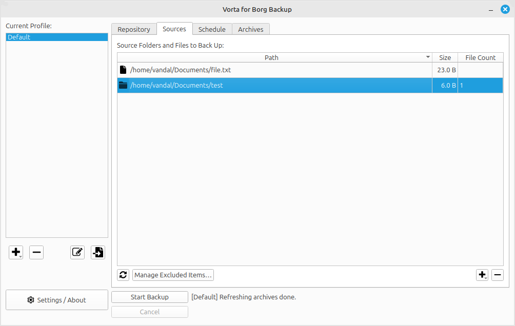 With your repo settings in place, you can now add some backup folders and make your first backup. Navigate to the Sources tab to add some folders or exclusions.