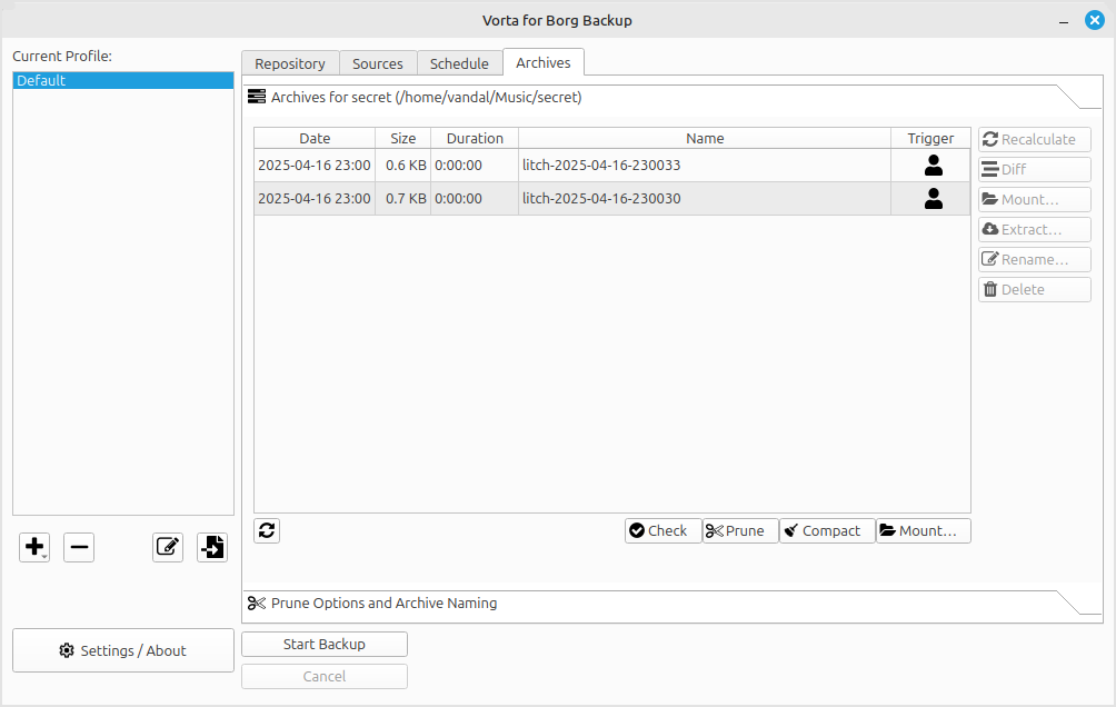 Next press Start Backup to do your first backup. After every successful backup (or snapshot), a new line will be added to the Archives tab. There you can also mount a snapshot and restore files.