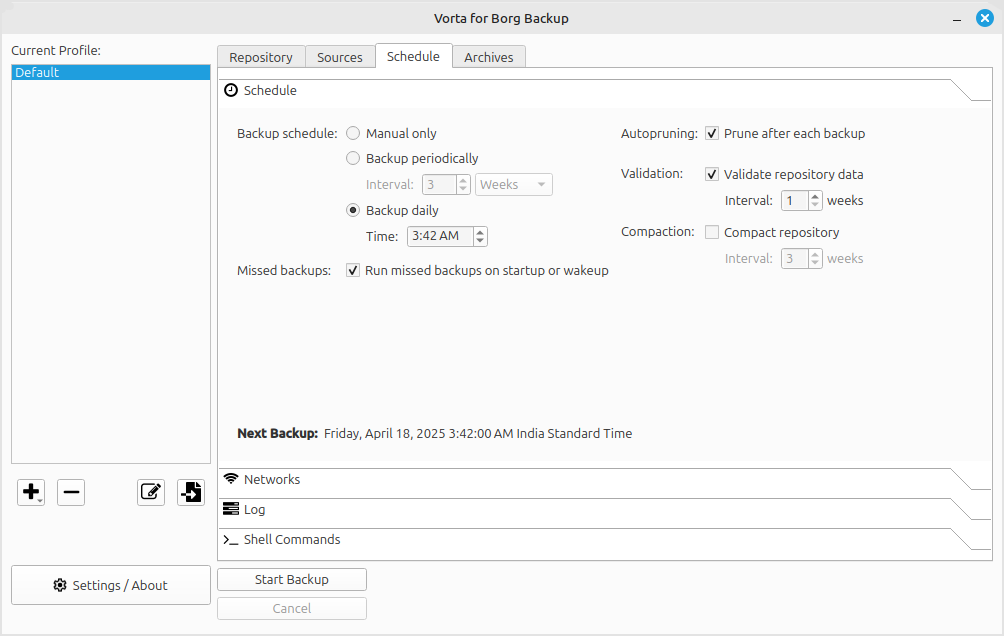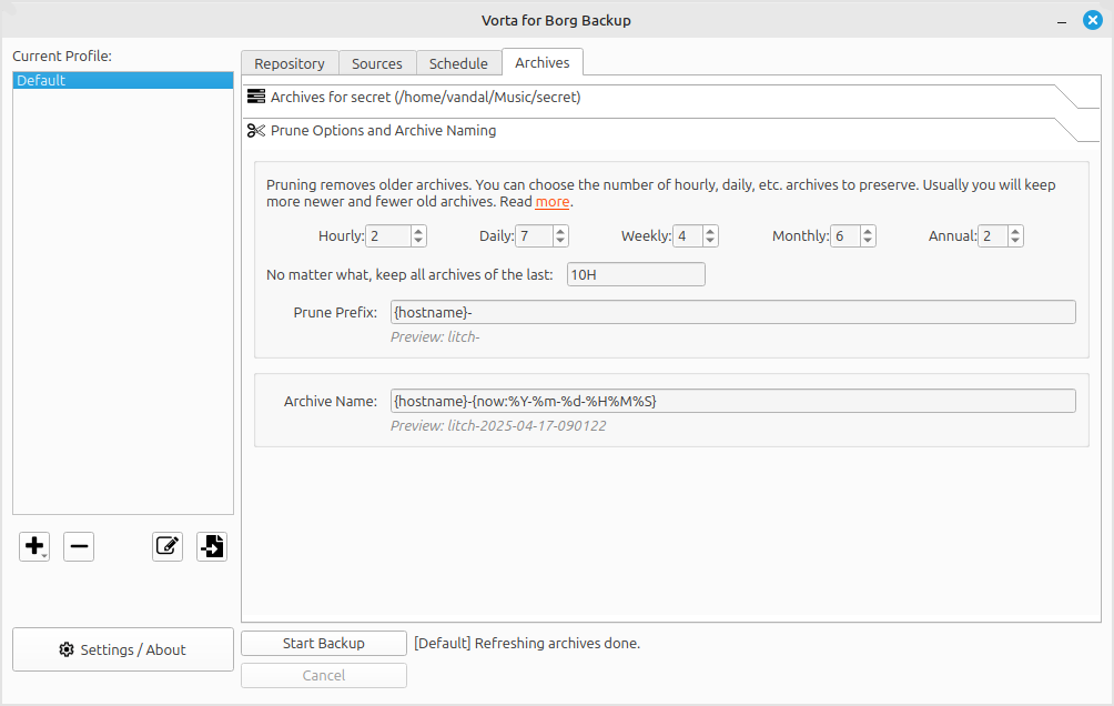 After this, Vorta will prune your archives according to your selected configuration each time it makes a backup.