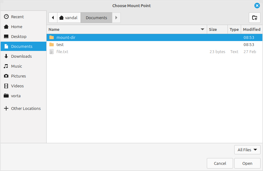 After opening the Archives tab in Vorta and selecting the snapshot you would like to restore from, click on the Mount button at the bottom. After a short wait, the following window should pop up.