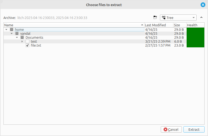There are two ways to restore files with Vorta, Extracting and Mounting. Both accomplish the same goal, but one may be preferable over the other depending on the situation. This guide will cover both methods.