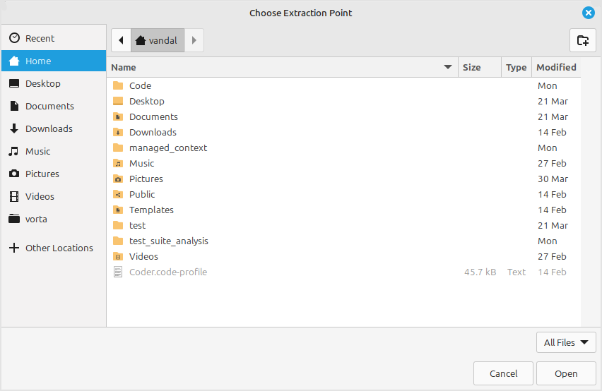 After opening the Archives tab in Vorta and selecting the snapshot you would like to restore from, click on the Extract button on the right side. After a short wait, the following window should pop up with the files from your backup.